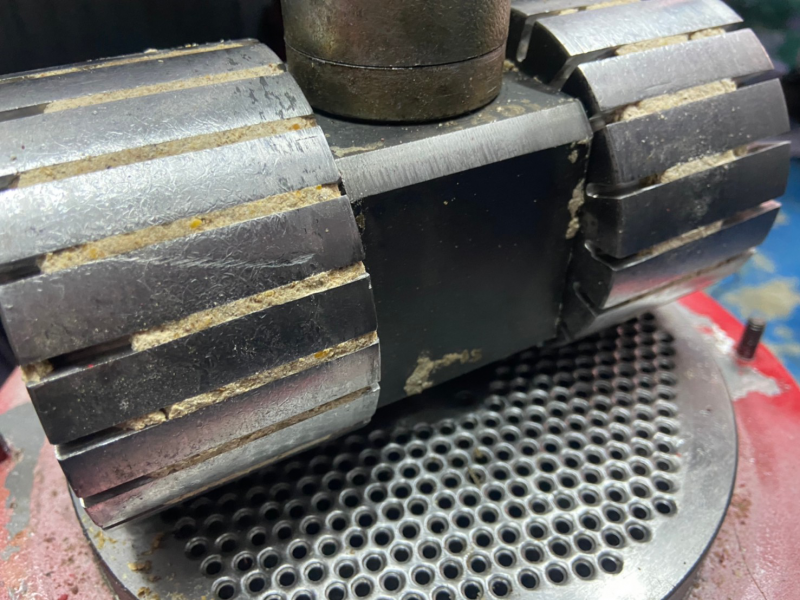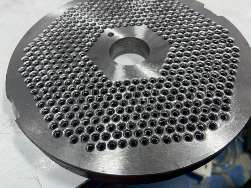 ออกแบบให้มีลักษณะเป็นแผ่นวงกลมเจาะรูโดดยตลอดทั้งแผ่น ใช้วัสดุเหล็กหล่อเช่นเดียวกับชุดอัดรีดวัตถุดิบ โดยรูมีขนาด 3 และ 4 มิลลิเมตร มีความหนา 20 และ 25 มิลลิเมตร ซึ่งขนาดและความยาวของรูจานบดอัดนี้ มีวัตถุประสงค์เพื่อสร้างความหนาแน่นให้กับผลิตภัณฑ์ให้เพียงพอต่อการจมน้ำ ซึ่งถือเป็นคุณลักษณะที่จำเป็นของการผลิตอาหารกุ้งขาว